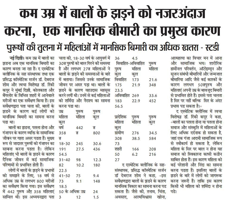Ignoring Early Hair Fall In Young Age, a Leading Cause Of Mental Illness – Hindustan Express, Delhi